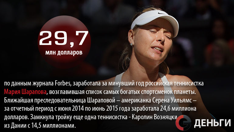 29,7 миллиона долларов по данным журнала Forbes, заработала за минувший год российская теннисистка Мария Шарапова, возглавившая список самых богатых спортсменок планеты.