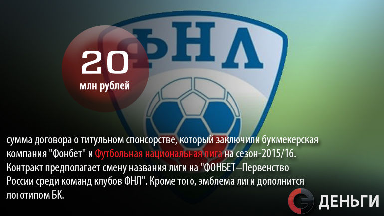 20 миллионов рублей - сумма договора о титульном спонсорстве, который заключили букмекерская компания "Фонбет" и Футбольная национальная лига на сезон-2015/16.