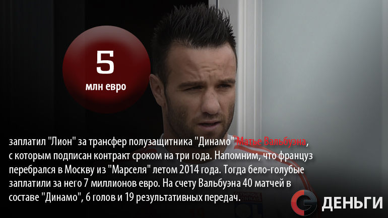 5 миллионов евро заплатил "Лион" за трансфер полузащитника "Динамо" Матье Вальбуэна, с которым подписан контракт сроком на три года.