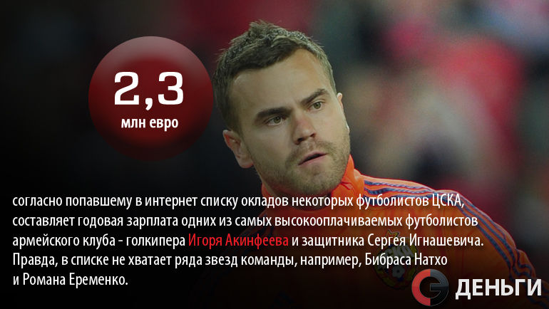 2,3 миллиона евро согласно попавшему в интернет списку окладов некоторых футболистов ЦСКА, составляет годовая зарплата одних из самых высокооплачиваемых игроков армейского клуба - голкипера Игоря Акинфеева и защитника Сергея Игнашевича.