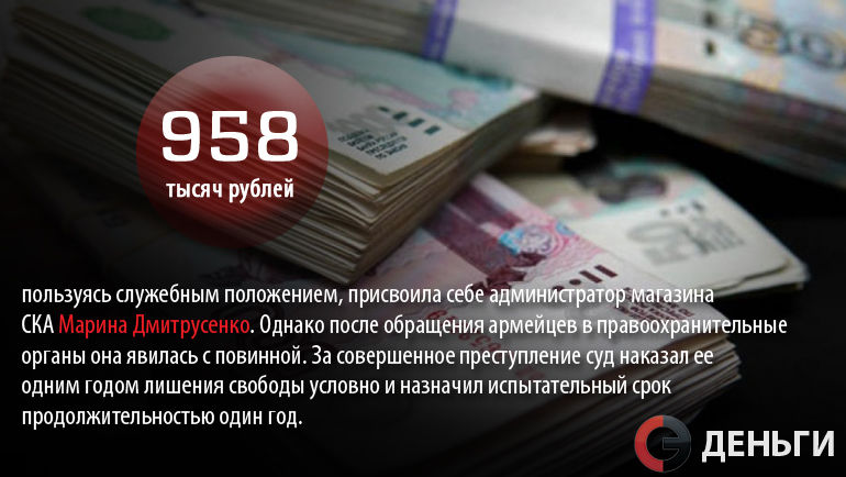 958 тысяч рублей пользуясь служебным положением, присвоила себе администратор магазина СКА Марина Дмитрусенко.
