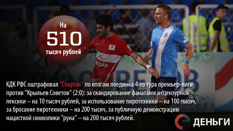 На 510 тысяч рублей КДК РФС оштрафовал "Спартак" по итогам поединка 4-го тура премьер-лиги против "Крыльев Советов" (2:0).