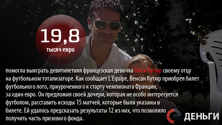 19,8 тысячи евро помогла выиграть девятилетняя французская девочка Люси Кутюр своему отцу на футбольном тотализаторе.