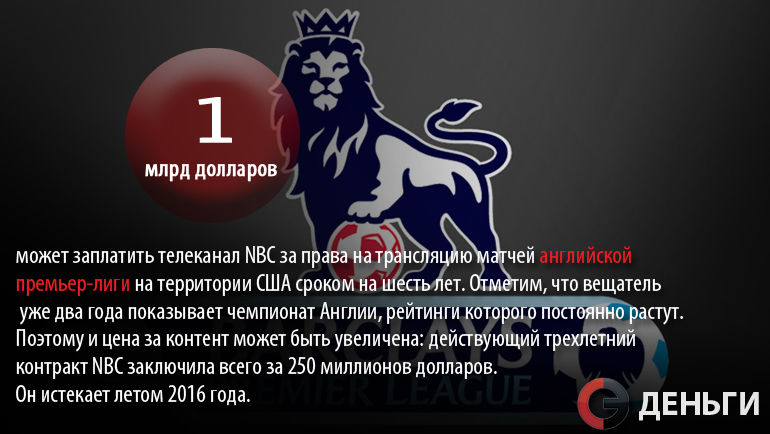 1 миллиард долларов может заплатить телеканал NBC за права на трансляцию матчей английской премьер-лиги на территории США.