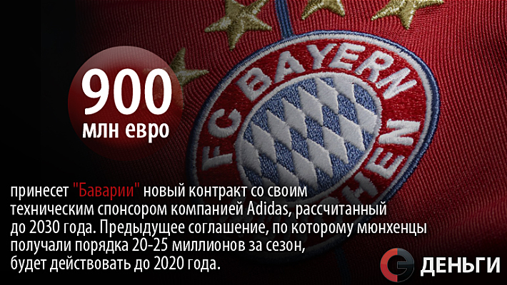900 миллионов евро принесет "Баварии" новый контракт со своим техническим спонсором компанией Adidas, рассчитанный до 2030 года.