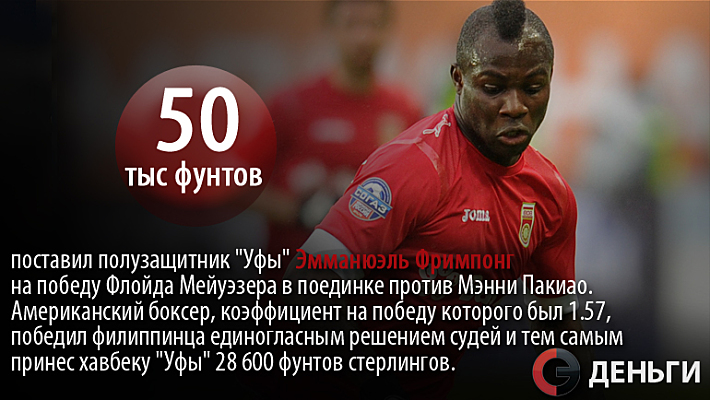 50 тысяч фунтов поставил полузащитник "Уфы" Эмманюэль Фримпонг на победу Флойда Мейуэзера в поединке против Мэнни Пакиао.