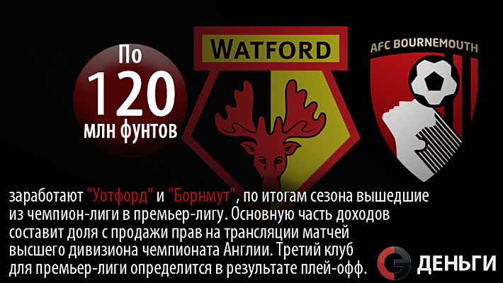 По 120 миллионов фунтов заработают "Уотфорд" и "Борнмут", по итогам сезона вышедшие из чемпион-лиги в премьер-лигу.