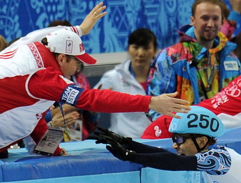 15 февраля. Сочи. Виктор АН выигрывает олимпийское золото на дистанции 1000 м и спешит разделить свою радость с главным тренером сборной России Себастьяном КРОСОМ. Фото – Федор УСПЕНСКИЙ, "СЭ"