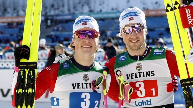 Норвежские лыжники Йоханнес Клебо и Эвен Нортуг стали победителями командного спринта на заключительном этапе Кубка мира-2024/25 в Лахти.
