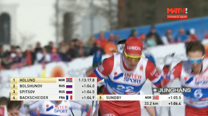 Так, Холунд ушёл на последний круг. Большунов не стал второй раз менять лыжи - 37 секунд ему ещё до лидера.