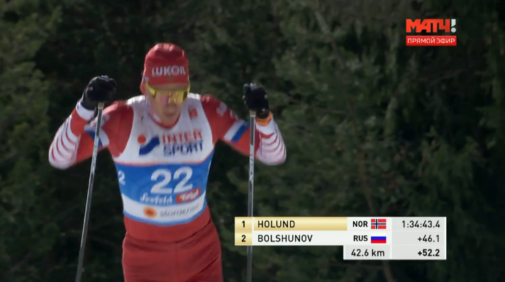 На отметке 42,6 км уже 46 секунд между Холундом и Большуновым! Заметно быстрее идёт Александр.