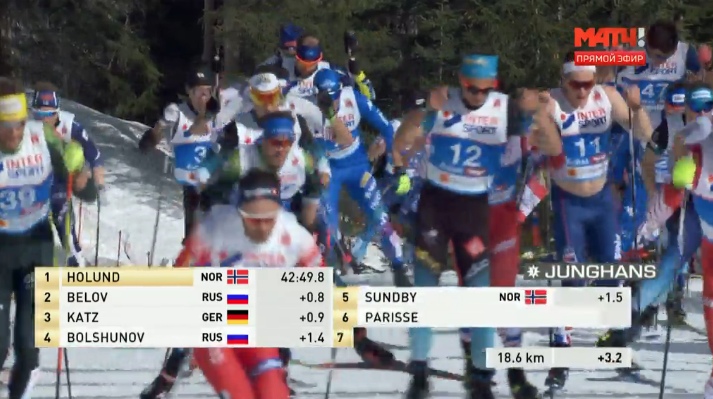 Перевалил за минуту отрыв Холунда, с ума сойти. Двое наших в пятёрке - Большунов и Мельниченко. Спицов уже 19-й, подтягивается. Белов тоже отыграл несколько позиций.