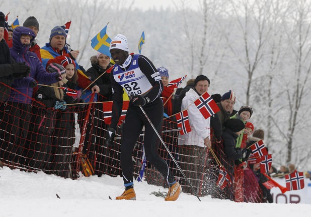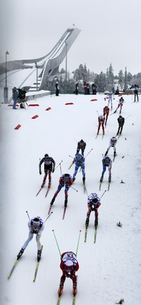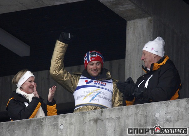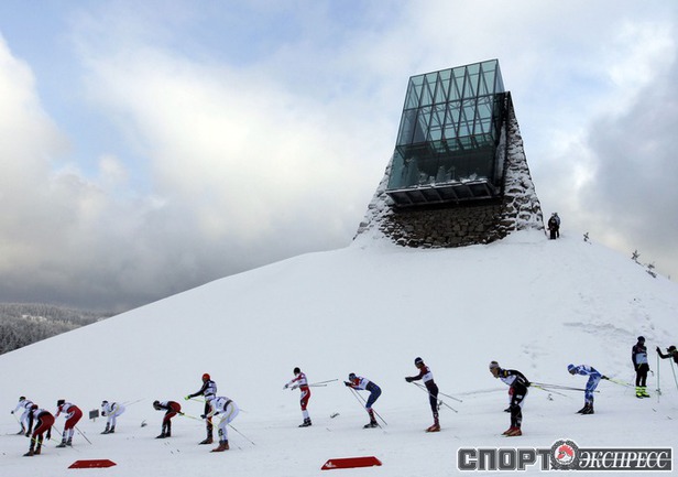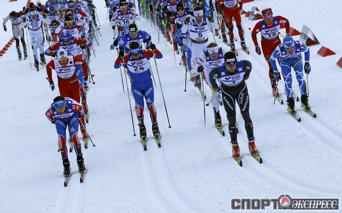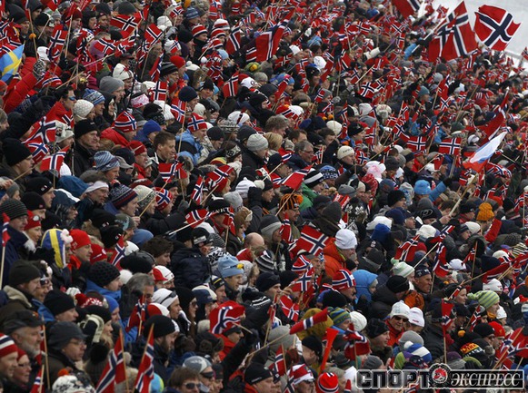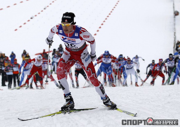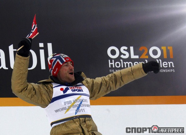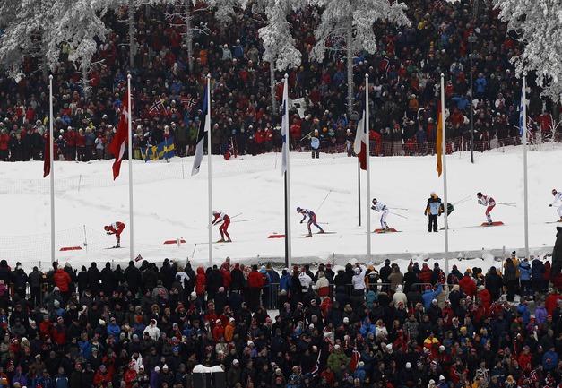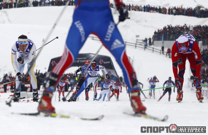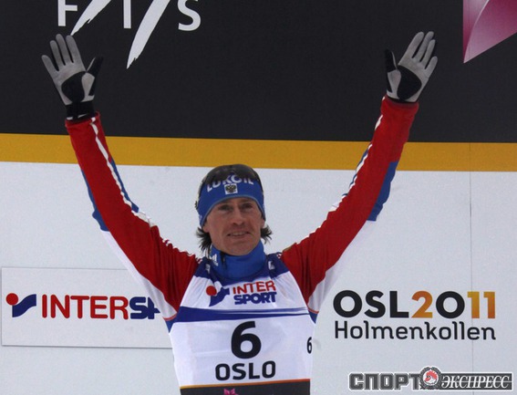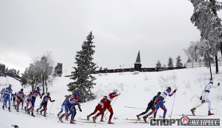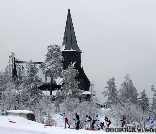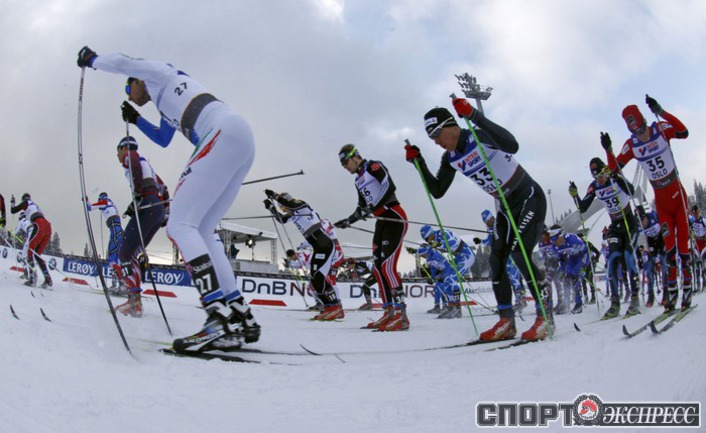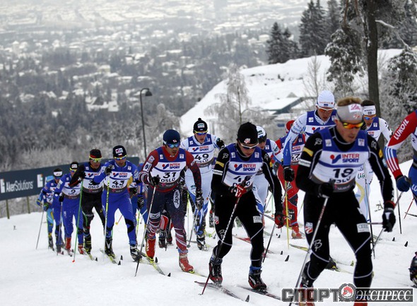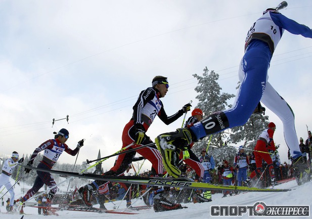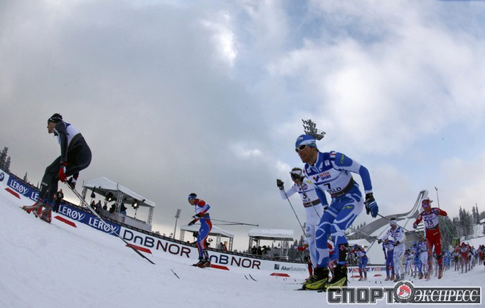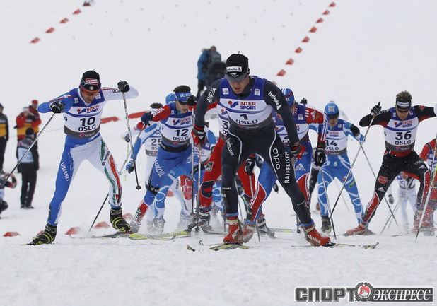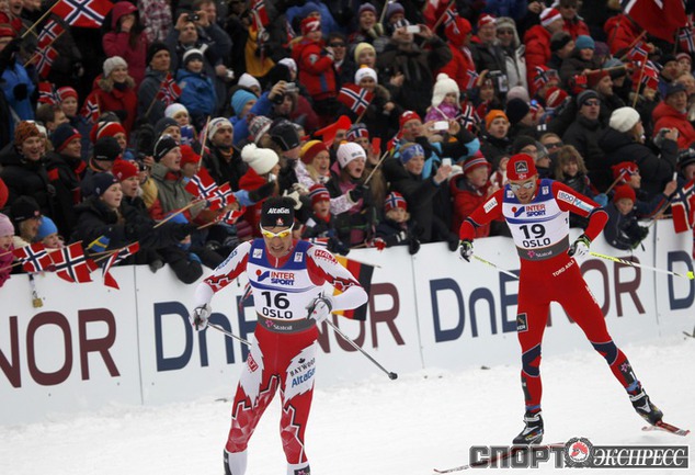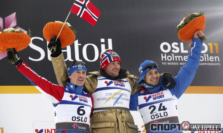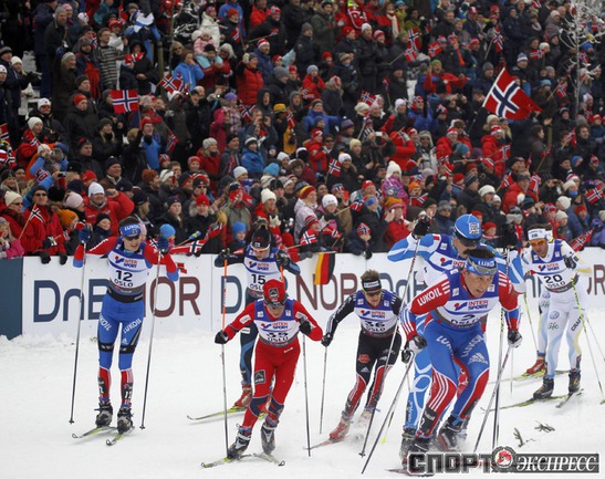 Холменколлен (Норвегия). Чемпионат мира. Мужчины. Дуатлон, 15+15 км. Вслед за норвежцем Питером Нортугом финишировали россияне Максим Вылегжанин и Илья Черноусов. Фото REUTERS