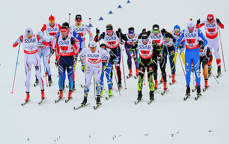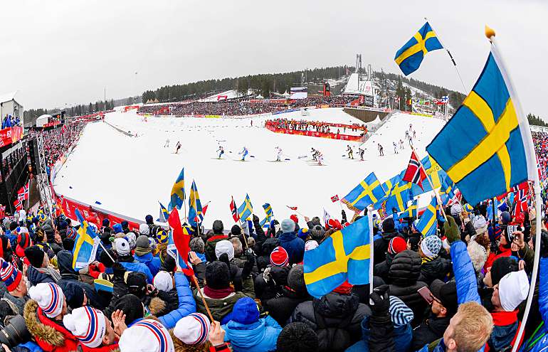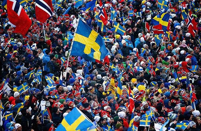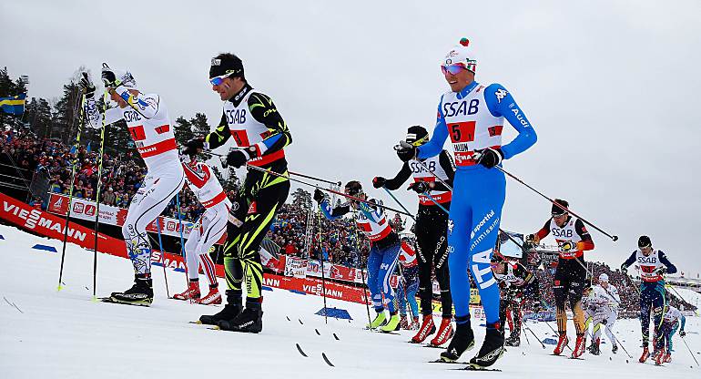 К началу старта атмосфера накалялась. Мой коллега, поселившийся в городке Евле, что в часе езды от Фалуна, рассказывал, что впервые за весь чемпионат мира ему не хватило сидячих мест в поезде. Не удивительно, что за пару минут до старта шумовое сопровождение для участников гонки зашкаливало. Подъехали члены королевских семей Швеции и Норвегии…