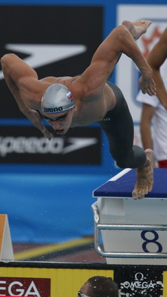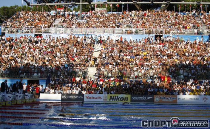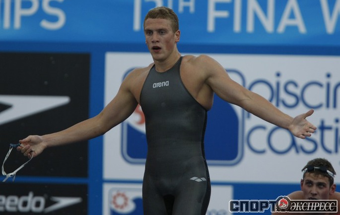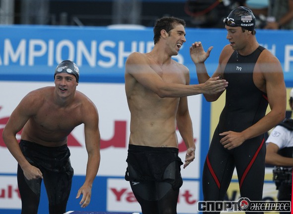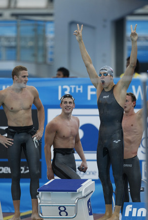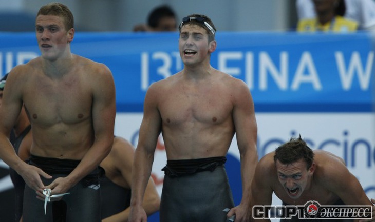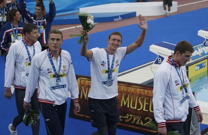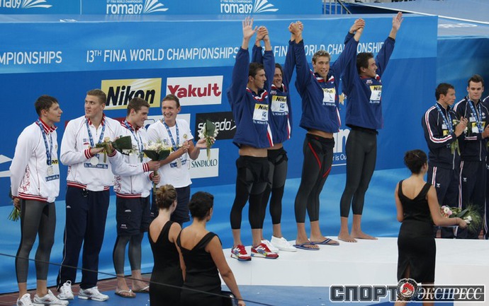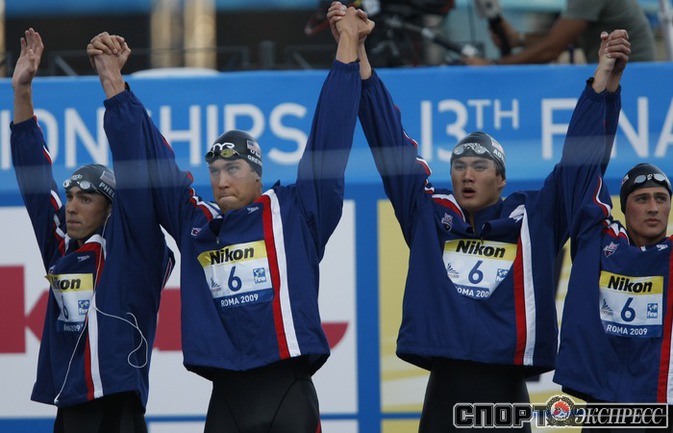26.07.2009. Рим. Чемпионат мира по водным видам спорта. Евгений Лагунов, Андрей Гречин, Данила Изотов и Александр Сухоруков завоевали серебро эстафеты 4х100 метров вольным стилем, пропустив вперед лишь американцев. Фото Александра ВИЛЬФА, "СЭ"