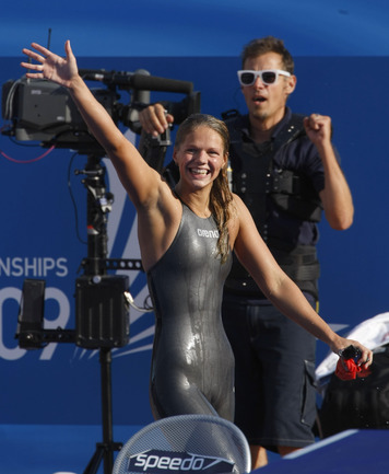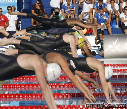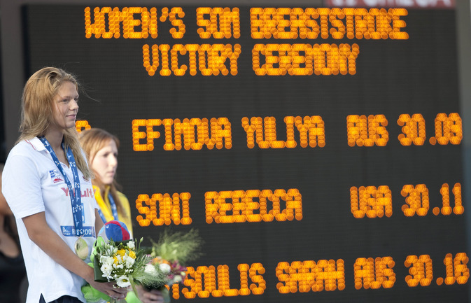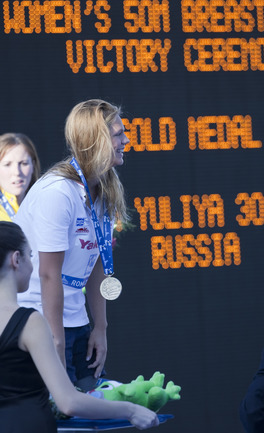 02.08.2009. Рим. Чемпионат мира по водным видам спорта. Женщины. 50 м, брасс. Юлия Ефимова выиграла золото с мировым рекордом: ее результат - 30,09! Предыдущий мировой рекорд на этой дистанции принадлежит канадке Аманде Ризон, который был установлен 8 июля этого года. Фото - Александр ВИЛЬФ, "СЭ"