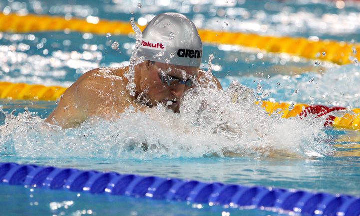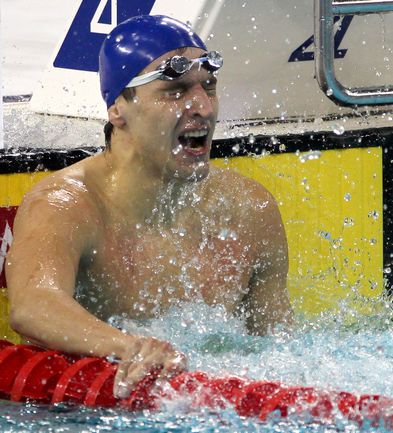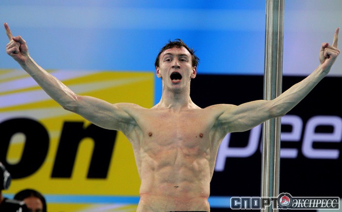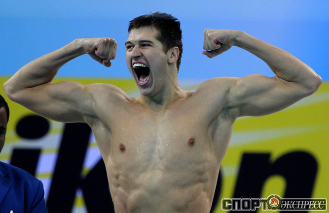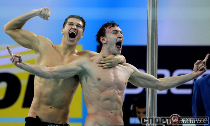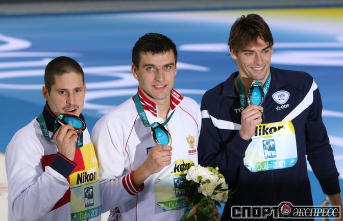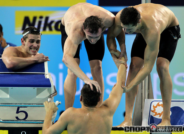 Дубай (ОАЭ). Чемпионат мира на короткой воде. Мужчины. Эстафета 4х200 метров, вольный стиль. Финал. 1. РОССИЯ (Лобинцев, Изотов, Лагунов, Сухоруков) – 6.49,04 (мировой рекорд). Евгений Коротышкин победил на 100 м баттерфляем. Станислав Донец принес России золото чемпионата мира-2010 на короткой воде в заплыве на 100 м на спине. Фото AFP