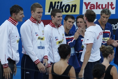 Едва был дан старт, камеры сфокусировались на лидерах. И было крайне неожиданно увидеть, как Лагунов передает эстафету Гречину четвертым. Сразу после 14-кратного олимпийского чемпиона Майкла Фелпса.