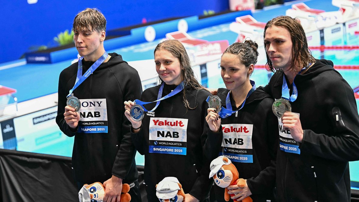Награждение по итогу смешанной эстафеты 4х100 м вольным стилем на ЧМ-2025 2 августа.