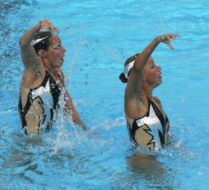 Чемпионат России по синхронному плаванию. Дуэты. 1. Россия (Анастасия Давыдова - Анастасия Ермакова) - 99,166 балла. 2. Украина (Ксения Сидоренко - Дарья Юшко - Юлия Марьянко) - 96,082. 3. Москва (Светлана Блохина - Наталья Злобина - Антонина Гриднева) - 93,000. |