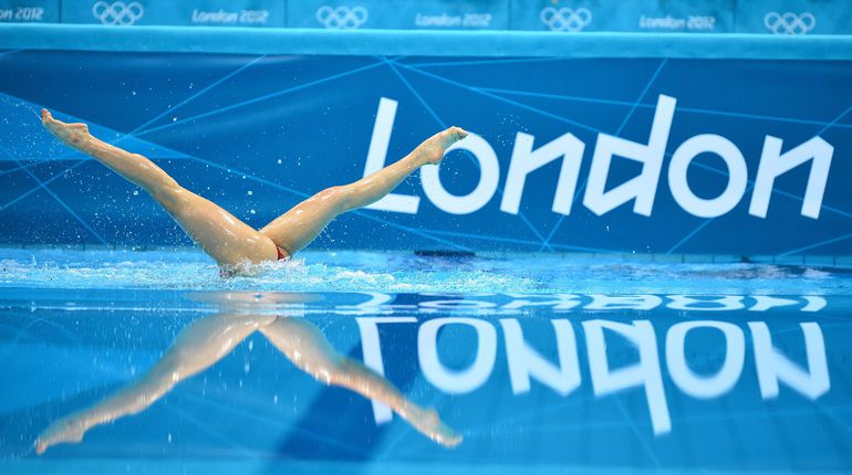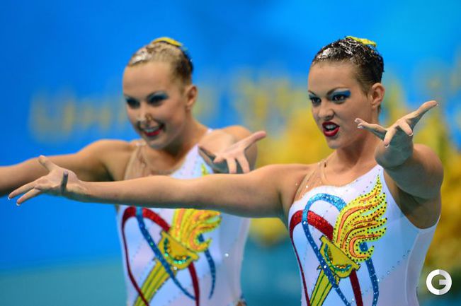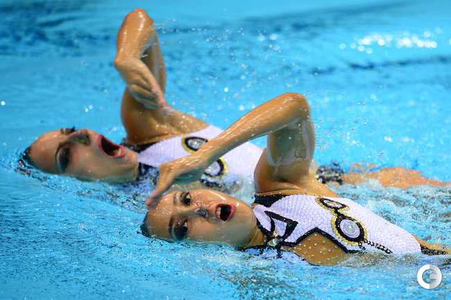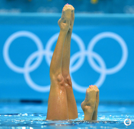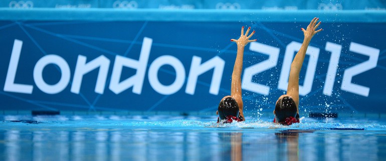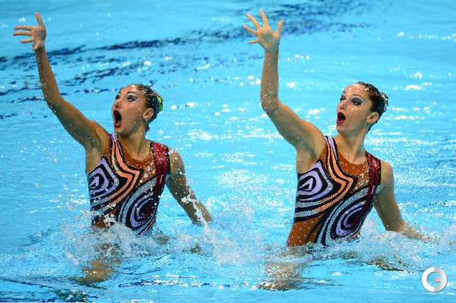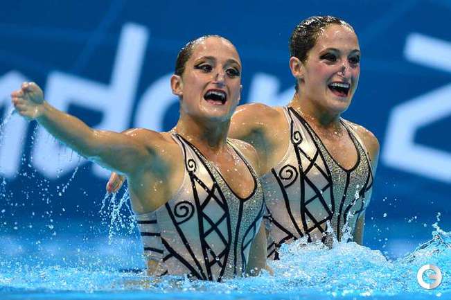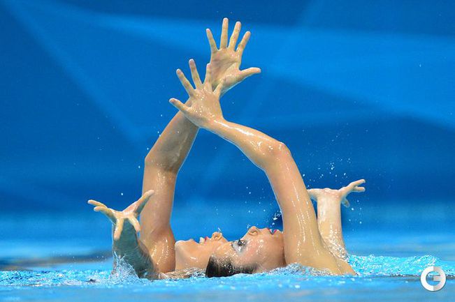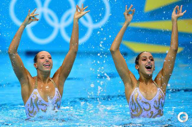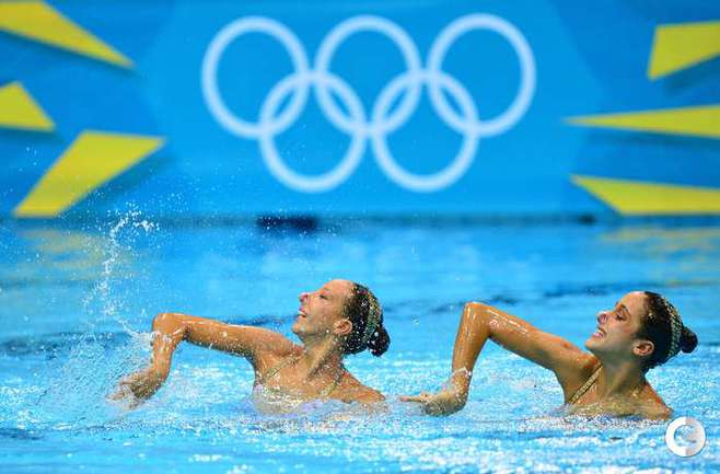 На Олимпиаде в Лондоне завершились квалификационные соревнования по синхронному плаванию. Произвольная программа. Российский дуэт Наталия Ищенко / Светлана Ромашина завершили выступления с лучшим на данный момент результатом – 98,600 – и с суммой обязательной и произвольной программ 196,800 балла и вышли в финал. Фото AFP