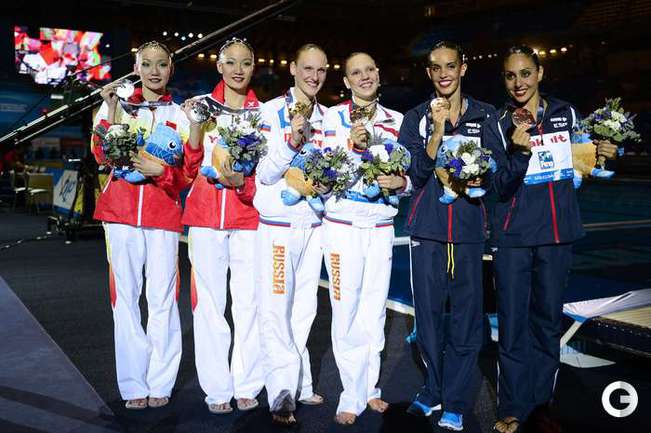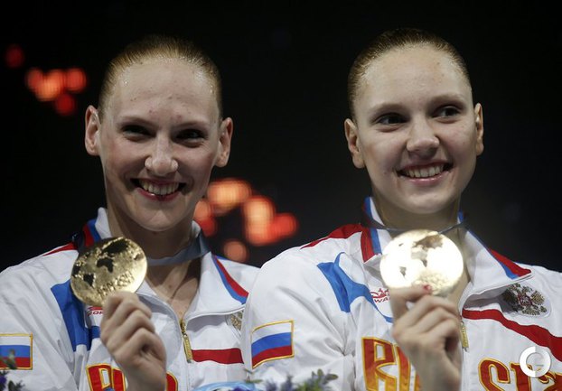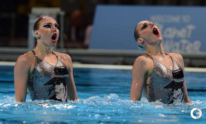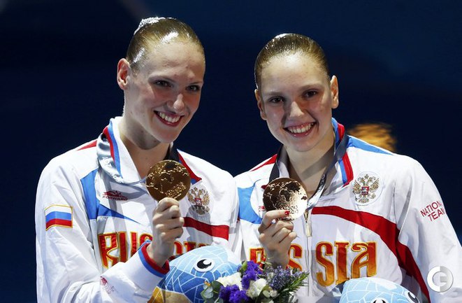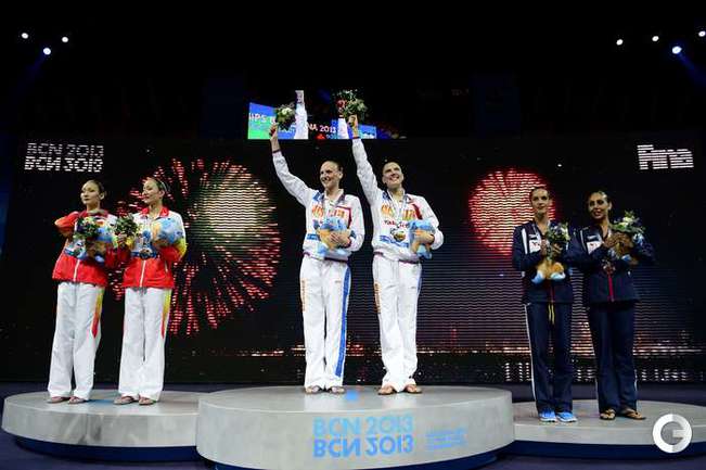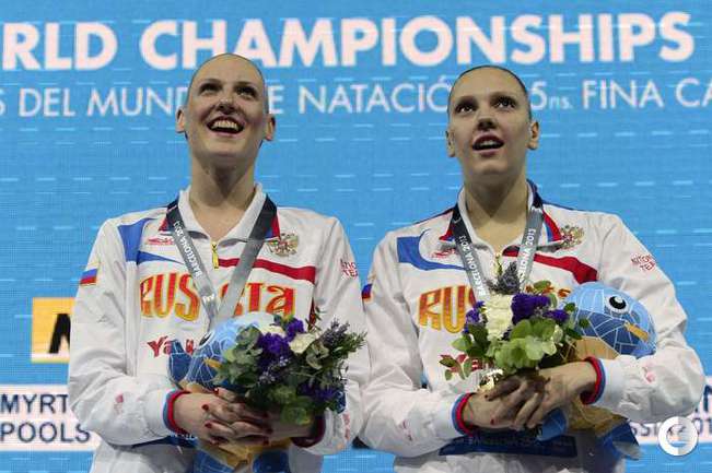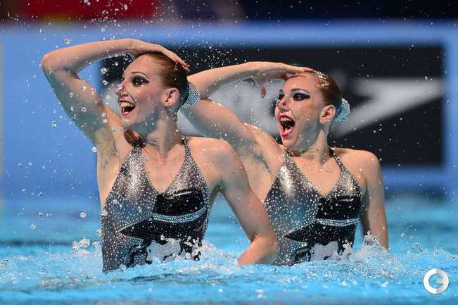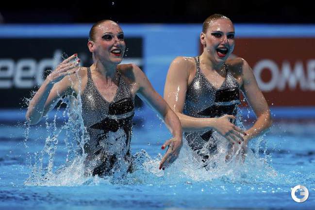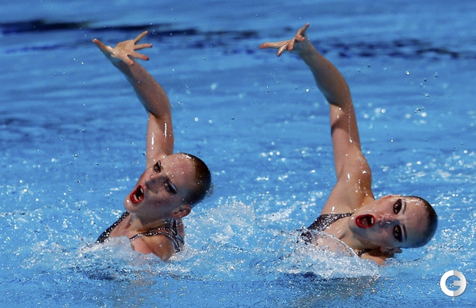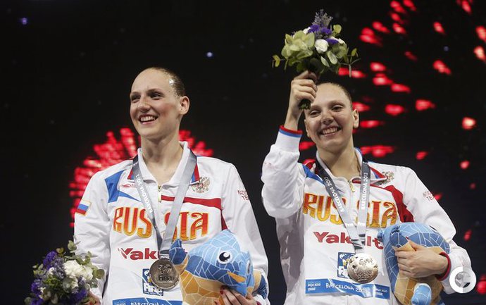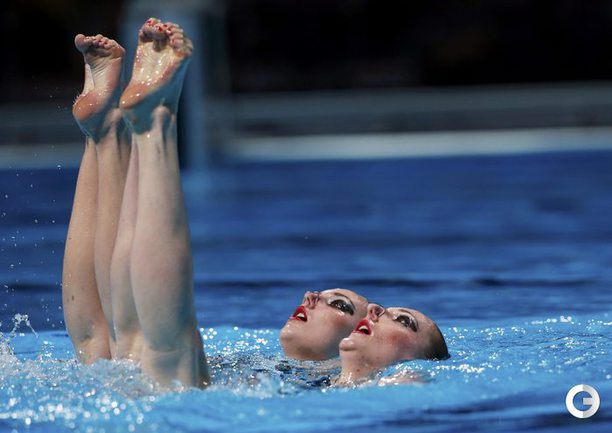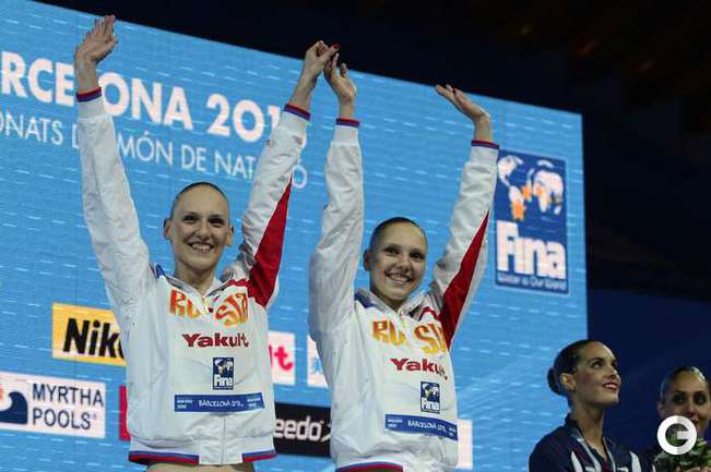 Российские синхронистки Светлана Колесниченко и Светлана Ромашина выиграли техническую программу дуэтов на чемпионате мира по водным видам спорта в Барселоне с результатом 97,300 балла. Фото AFP, REUTERS