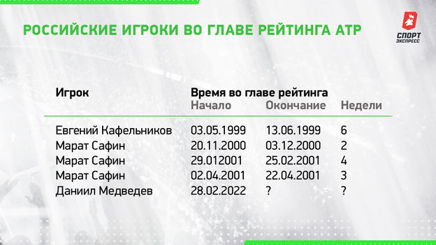 Медведев — третий российский теннисист, который возглавит рейтинг АТР. В 1999 году на вершине ненадолго засветился Евгений Кафельников, а с ноября 2000-го по ноябрь 2001-го Марат Сафин вел борьбу за первенство с Густаво Куэртеном, трижды выходя в лидеры и трижды уступая место бразильцу.