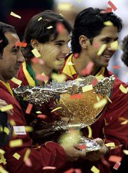 Премьер-министр Испании Хосе Луис Сапатеро в понедельник принял в своей резеденции сборную Испании, завоевавшую накануне Кубок Дэвиса. Глава правительства отметил высочайшее мастерство теннисистов и вручил лидеру команды Рафаэлю Надалю специальную награду. "Сейчас у нас есть поколение спортсменов, которое является лучшим за всю историю Испании, - приводит AP слова Сапатеро. - Вы знаете, как побеждать на самых престижных соревнованиях и как перебороть себя в тяжелые минуты. Вы - настоящие символы Испании, ее послы. В следующем году мне хотелось бы снова вас принять". Напомним, в финале Кубка Дэвиса Испания уверенно победила Чехию со счетом 5:0 и в четвертый раз стала обладательницей Серебряной салатницы.