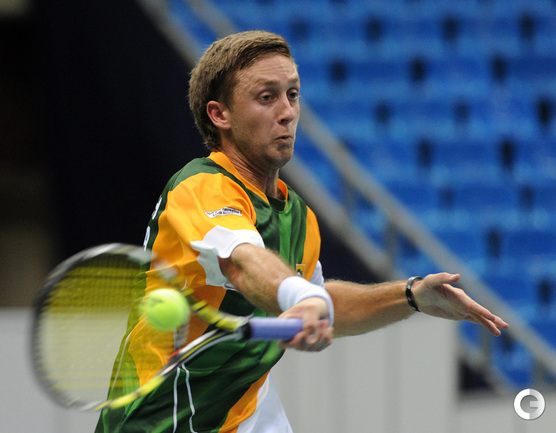 Москва. Теннис. Кубок Дэвиса. Плей-офф за место в группе I. Зона Европа/Африка. РОССИЯ – ЮАР – 2-0. Карен Хачанов – Дин О'Брайен – 7:5, 6:1. Богомолов – де Клерк – 6:7 (3:7), 6:0, 6:4, 6:1. Россиянин Алекс Богомолов одержал победу над Якобом Конрадом де Клерком в матче за право остаться в первой группе зоны Европа/Африка Кубка Дэвиса между сборными России и ЮАР. Напомним, ранее очко в копилку сборной России принес Карен Хачанов. Фото - Никита УСПЕНСКИЙ, "СЭ"