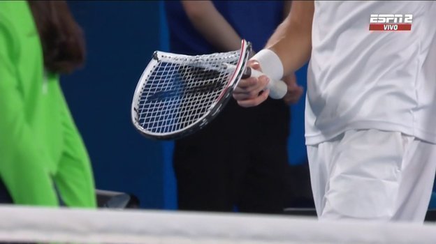 После поражения в гейме на подаче соперника при счете 2:4 Медведев не выдержал и сломал ракетку, бросив ее в корт.
