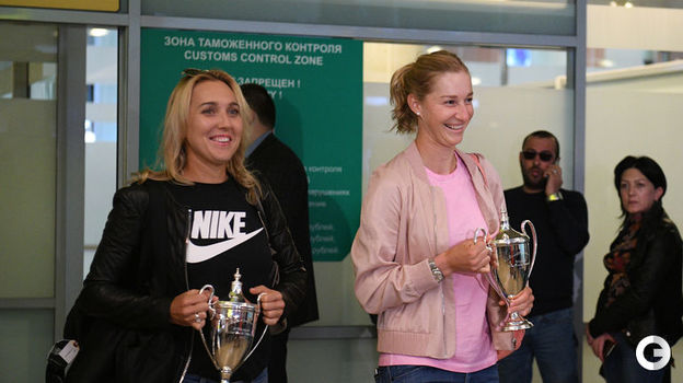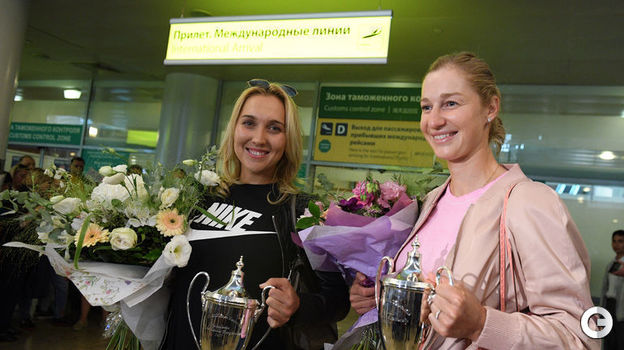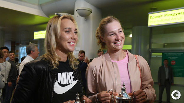 Елена Веснина и Екатерина Макарова, разгромившие в финале Уимблдона Чань Хаочэнь и Монику Никулеску (6:0, 6:0), вернулись в Россию с трофеем турнира "Большого шлема". Кадры встречи чемпионок - в галерее "СЭ".
