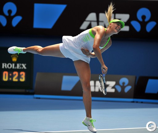 Теннис. Мельбурн (Австралия). Турнир "Большого шлема" Australian Open.Общий призовой фонд 26 830 000 австралийских долларов. Открытые корты, хард. Женщины. Одиночный разряд. Российская теннисистка Мария Шарапова во втором круге Australian Open обыграла Джейми Хэмптон (6:0, 6:1). Фото AFP