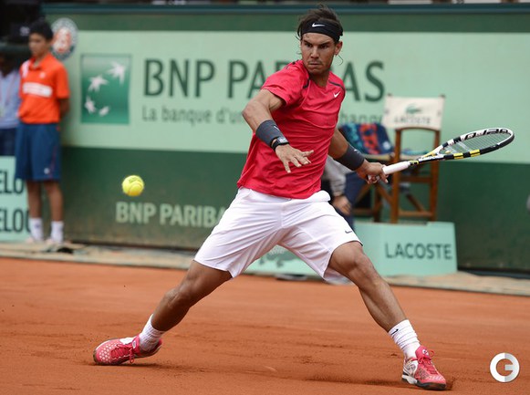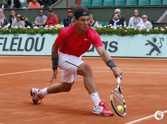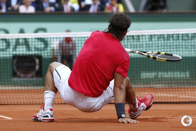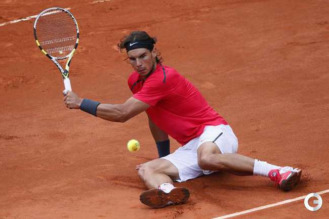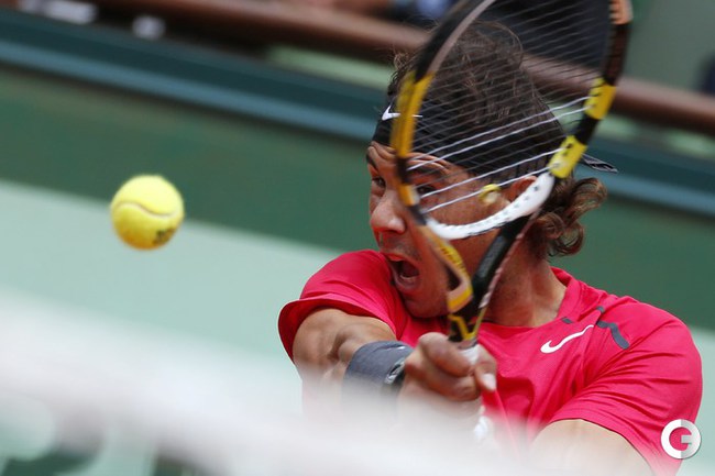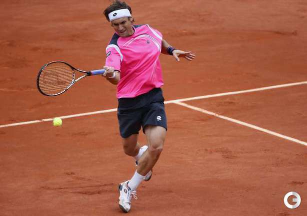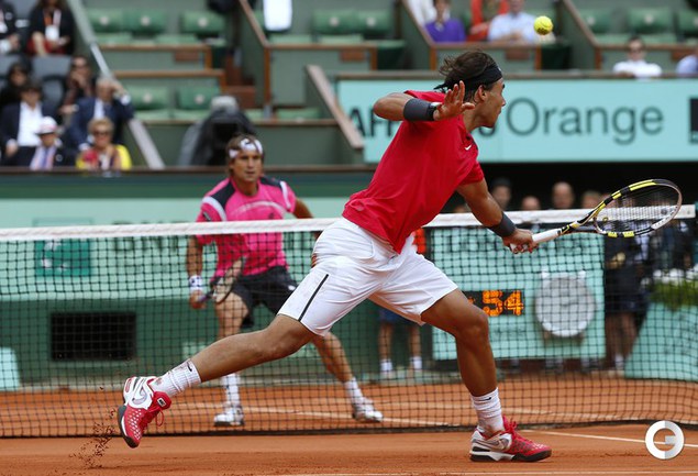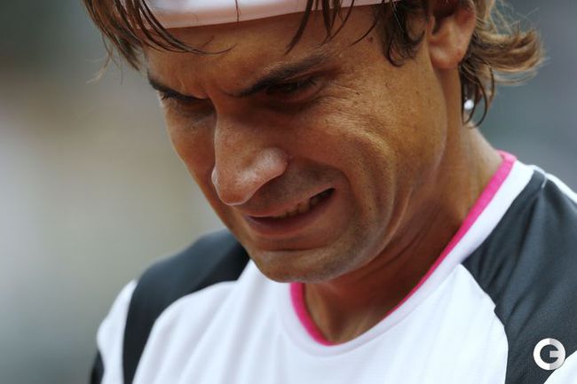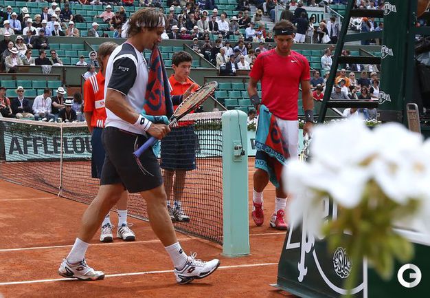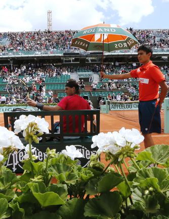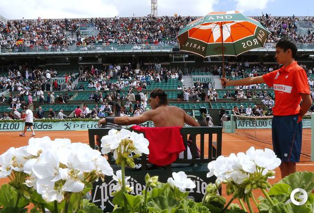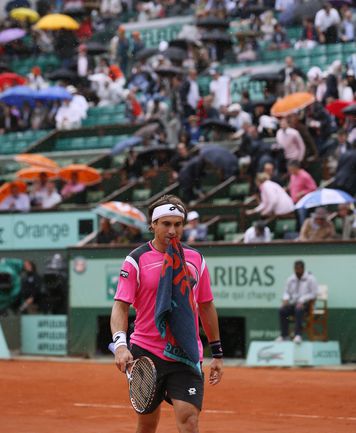 Полуфинальный матч Roland Garros в одиночном разряде у мужчин между второй ракеткой мира испанцем Рафаэлем Надалем и его соотечественником, занимающим шестую строчку в мировом рейтинге, Давидом Феррером был прерван из-за дождя при счете 6:2, 4:1 в пользу Надаля. Фото AFP