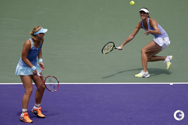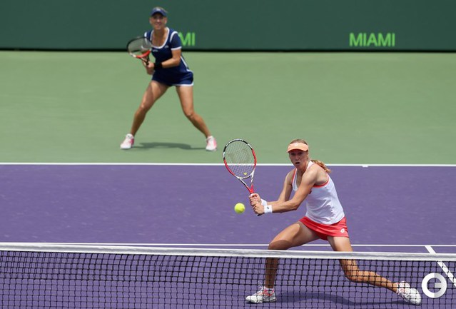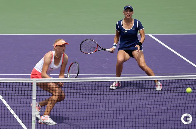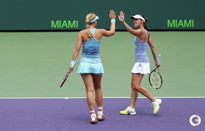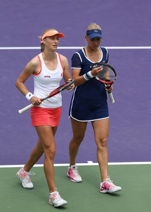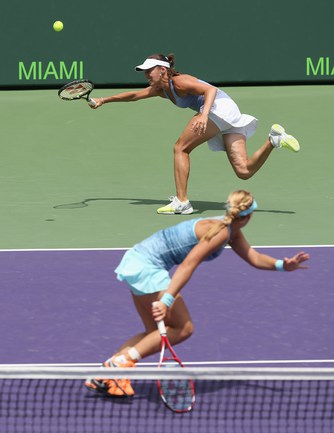 Майами (США). Женский турнир Sony Open Tennis. Призовой фонд 4 720 380 долларов. Открытый корт, хард. Парный разряд. Финал. Хингис/Лисицки (Швейцария/Германия) - МАКАРОВА/ВЕСНИНА (Россия) – 4:6, 6:4, 10:5. Россиянки Екатерина Макарова и Елена Веснина уступили представительнице Швейцарии Мартине Хингис и немке Сабине Лисицки в финале парного турнира в Майами. Фото REUTERS и AFP