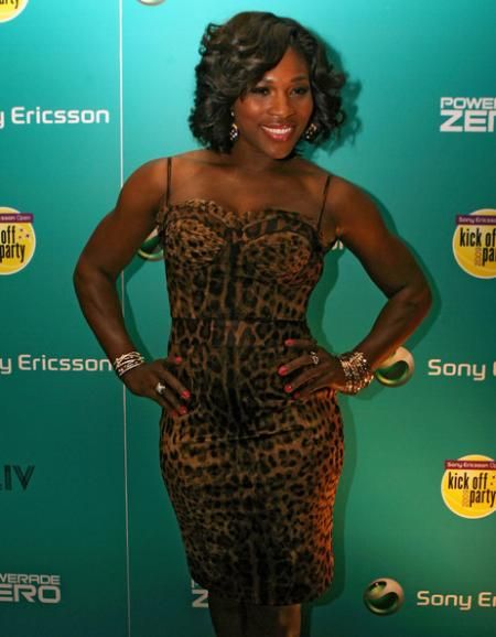 Серена Уильямс в смелом леопардовом платье на красной ковровой дорожке на вечеринке в отеле Fountainbleau в Майами перед стартом Sony Ericsson Open в марте 2009.