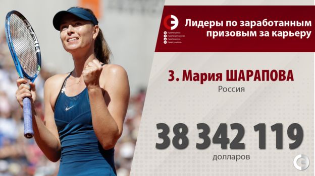 Бывшая первая ракетка мира Мария Шарапова заняла третье место в рейтинге по количеству заработанных призовых за карьеру. Россиянка заработала за 17 лет профессиональной карьеры 38 342 119 долларов. Возглавляет рейтинг американка Серена Уильямс – 88 233 301 долларов. Первая ракетка мира Симона Халеп – на шестой строчке (28 145 579 долларов).