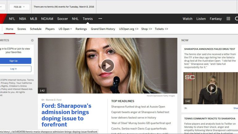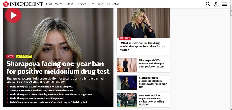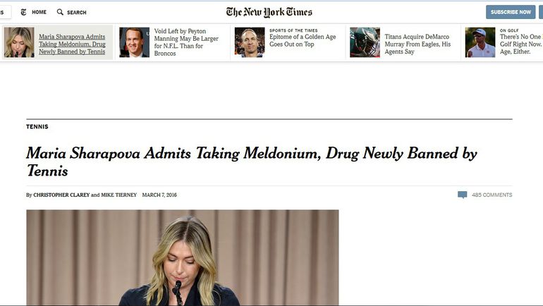 Издание отмечает, что заявление Шараповой стало полнейшей неожиданностью. Приводятся цитаты из ее выступления, интервью адвоката спортсменки, мнения экспертов и экс-игроков. Также кратко разъясняется, что представляет из себя милдронат. Несмотря на то что по правилам ВАДА максимальное наказание за его использование равно четырем годам, авторы напоминают о том, что известным теннисистам обычно сокращают срок дисквалификаций.