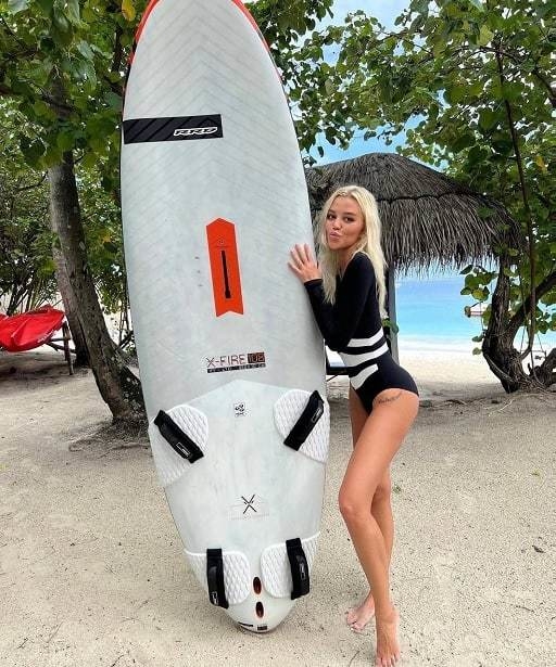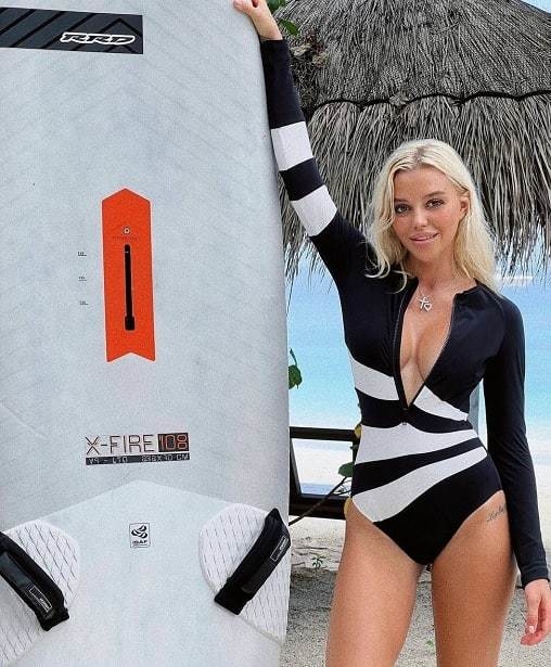 Девушка показала подписчикам фото в купальнике на молнии. На снимках девушка стоит с сапбордом — это доска, на которой плавают стоя.