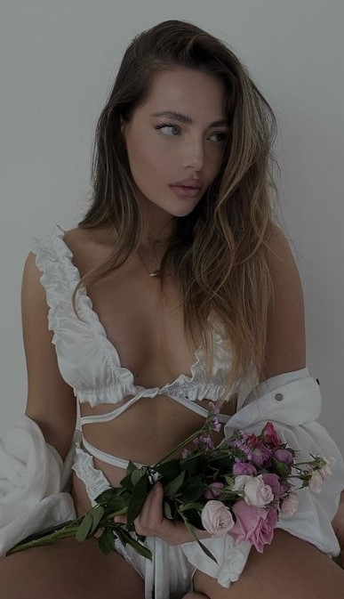 На фотографии девушка предстала в шелковом нижнем делом белье с букетом цветов.