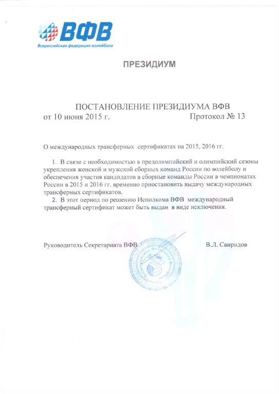 "В связи с необходимостью в предолимпийский и олимпийский сезоны укрепления женской и мужской сборных команд России по волейболу и обеспечения участия кандидатов в сборные команды России в чемпионатах России 2015 и 2016 гг. временно приостановить выдачу международных трансферных сертификатов.
