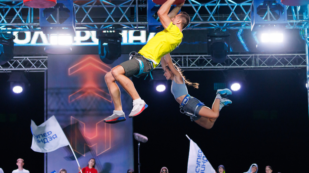 В новом выпуске на трассу один за другим вышли супруги — Яна и Руслан Пушкаревы. Учителя из Санкт-Петербурга серьезно увлекаются ниндзя-спортом и давно мечтали покорить трассу «Суперниндзя».