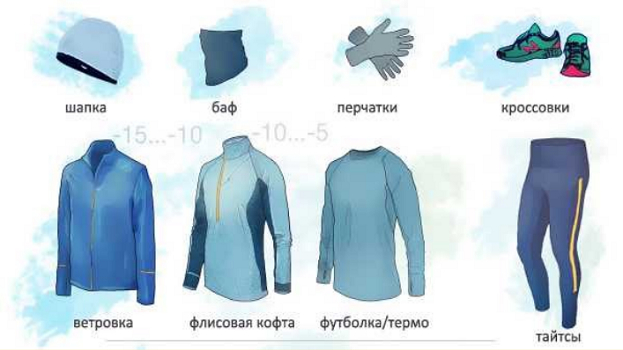 Самый важный аспект зимней экипировки для бега — многослойность. Многим людям, привыкшим бегать летом, кажется, что чем теплее они будут одеваться на пробежку, тем лучше. Тем не менее золотое правило, признанное за стандарт в мире бега: «Для бега на улице вы должны быть одеты так, как будто на улице теплее на 10 градусов, чем показывает термометр». То есть если за окном -5 C, то ваша экипировка должна соответствовать +5 C.