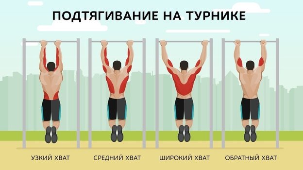 Возьмитесь за турник обратным хватом, когда ладони направлены к себе. Кисти рук находятся уже плеч. Затем согните руки в локтевых суставах. Подтянитесь грудью к перекладине. Подбородок нужно завести выше ее уровня. В верхней точке задержитесь на две секунды и спокойно опуститесь вниз.