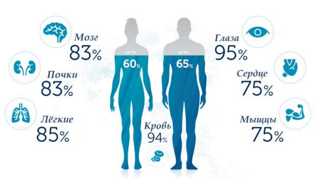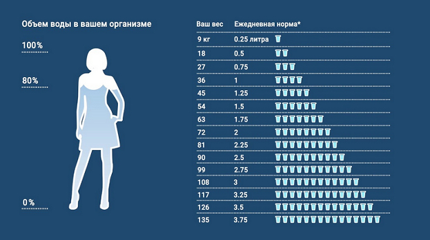 Взрослый человек на 80% состоит из воды, поэтому для полноценной работы организма нужно выпивать достаточное количество жидкости, чтобы поддерживать его в здоровом состоянии.