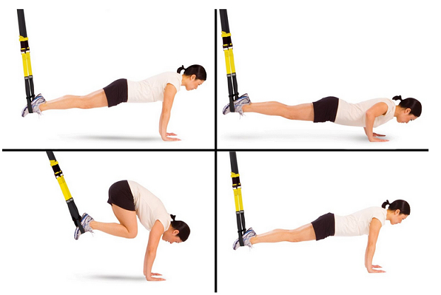 Примите упор лежа с закрепленными ногами в лямках петель, как в первом упражнении.