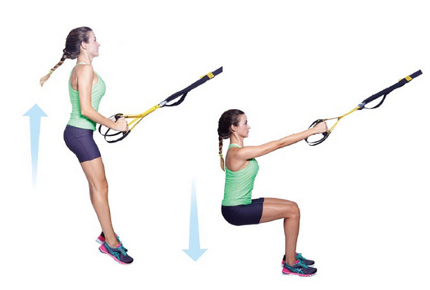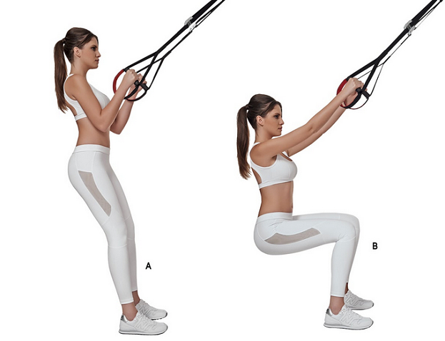 Подойдите к тренажеру лицом и возьмите лямки строп в руки. Начинайте медленно приседать, переведя весь вес тела на пятки. В процессе приседания вы должны почувствовать, что как будто висите руками на петлях и без их помощи упадете.