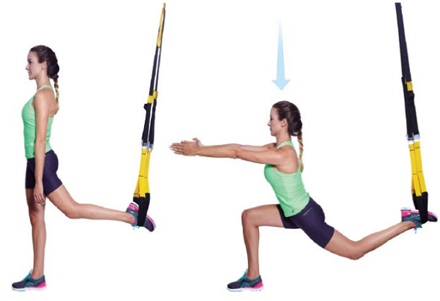 Закрепите лямки строп на голеностопе правой ноги, левой ногой уйдите в выпад вперед. Руки на поясе или выпрямлены спереди.