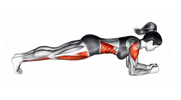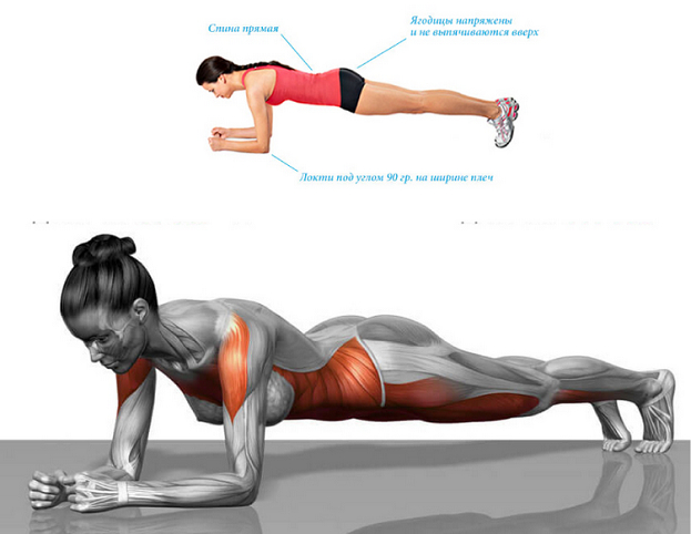 Большим плюсом упражнения является статичность ее выполнения, что позволяет не нагружать суставы. Также при выполнении планки задействуются мышцы: